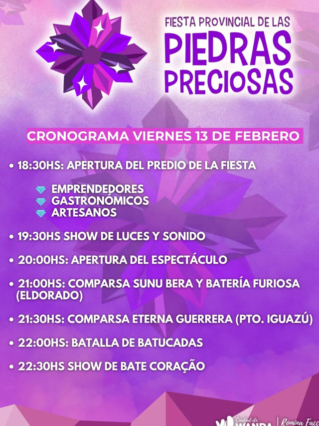 AGENCIA MISIONES.UNO | Este viernes comenzó en Wanda la Fiesta Provincial de las Piedras Preciosas 2026 con la Noche de Carnaval, que se desarrolla en el Polideportivo Fitti Kruse con entrada libre y gratuita.